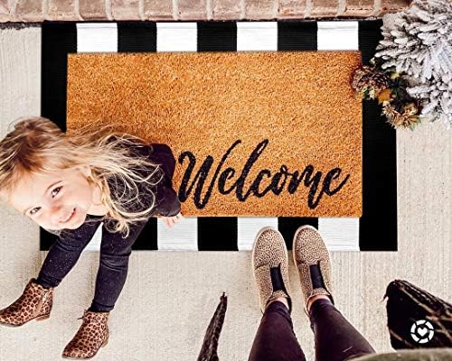Experience the luxury of our KOZYFLY black and white front door mat, expertly handcrafted from premium cotton. This mat features a low pile thickness of just 0.14 inches, making it 20% denser than standard outdoor mats, ensuring a plush feel underfoot. Crafted from environmentally-friendly materials, this durable rug promises long-lasting use for all your entryway needs.